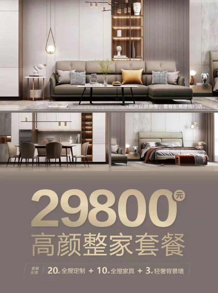 套餐当中包含了20㎡全屋柜类定制(18种轻奢花色)、10件全屋家具(含沙发、茶几、餐桌椅、床和床垫等),3㎡轻奢背景墙(18种花色任选)三大品类,在满足消费者“颜值至上”的消费需求外,实现一体化设计、一站式配齐、一揽子服务,实现同一风格的家具、墙、配高颜整家定制。