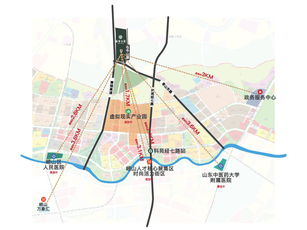 项目位于石牛山路枣山路交界处,三山一水环绕。