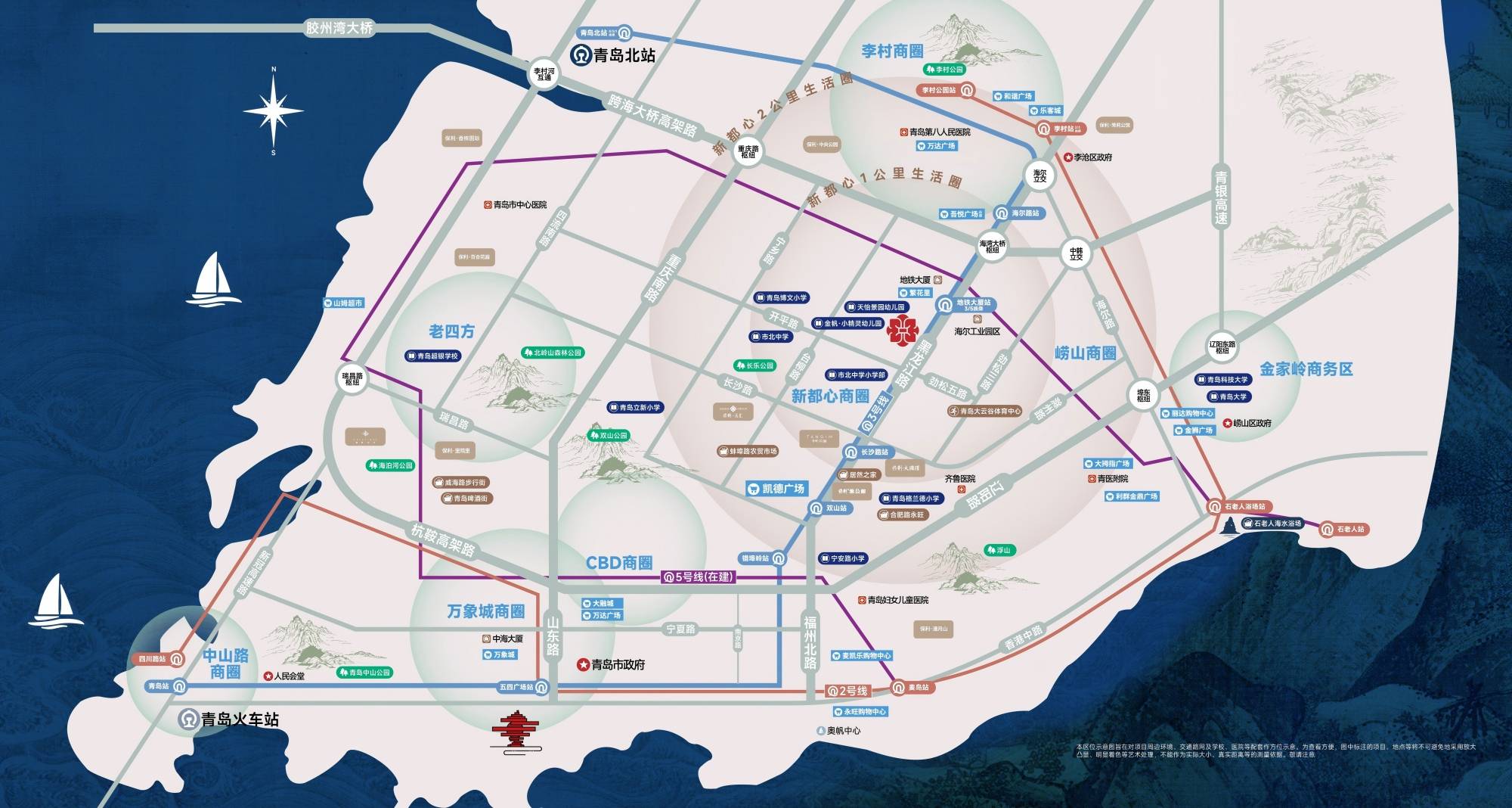 地铁3号线、地铁5号线(计划2028年通车)双地铁换乘,黑龙江路、重庆南路等城市主干道环伺,立体交通,畅达全城,高效连接市南、崂山、李沧。