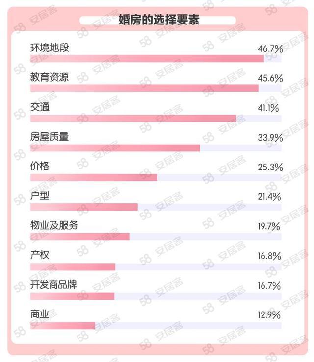 在近日58同城和安居客发布的《2021年婚房置业报告》显示,环境地段、教育资源和交通状况等成为调研人群选择婚房的主要因素。对当下适龄且主力的购房人群而言,社区的商业配套在婚房要素中,排在最后一位。