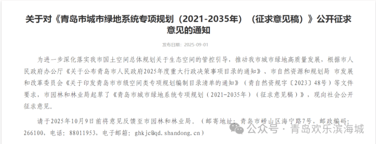 9月1日,青岛市园林和林业局发布了关于对《青岛市城市绿地系统专项规划(2021-2035年)(征求意见稿)》公开征求意见的通知。