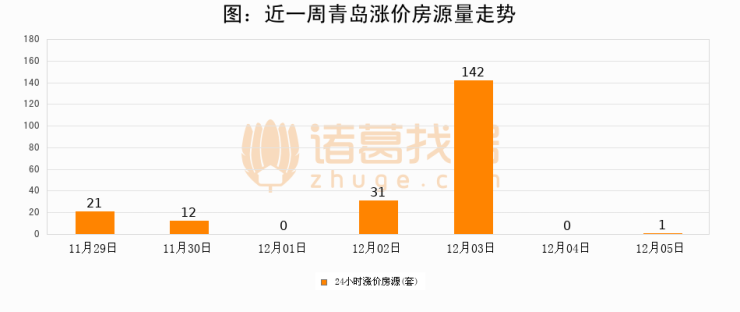 根据诸葛找房数据显示,青岛24小时涨价房源量为1套,较12月04日增加1套,环比上涨0%。与此同时,涨价房源占比小幅扩大,业主信心有所提升。