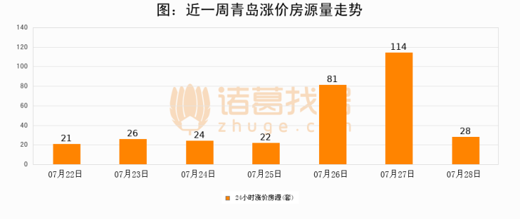 根据诸葛找房数据显示,青岛24小时涨价房源量为28套,较07月27日减少86套,环比下降75.4%。与此同时,涨价房源占比小幅回落,对于购房者来说是一个入市窗口期,购房者可抓住时机入市。