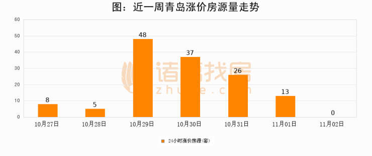 根据诸葛找房数据显示,青岛24小时涨价房源量为0套,较11月01日减少13套,环比下降100%。与此同时,涨价房源占比小幅回落,对于购房者来说是一个入市窗口期,购房者可抓住时机入市。