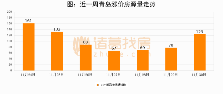 根据诸葛找房数据显示,青岛24小时涨价房源量为123套,较11月29日增加45套,环比上涨57.7%。与此同时,涨价房源占比小幅扩大,业主信心有所提升。