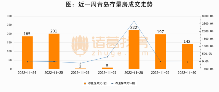从存量房来看,2022年11月30日青岛存量房单日成交142套,比昨日减少55套,环比下降27.9%。从近一周存量房成交来看,青岛存量房日均成交套数为136套,其中11月28日成交量最高为222套,11月30日单日成交142套,高于近一周平均水平4.4%。
