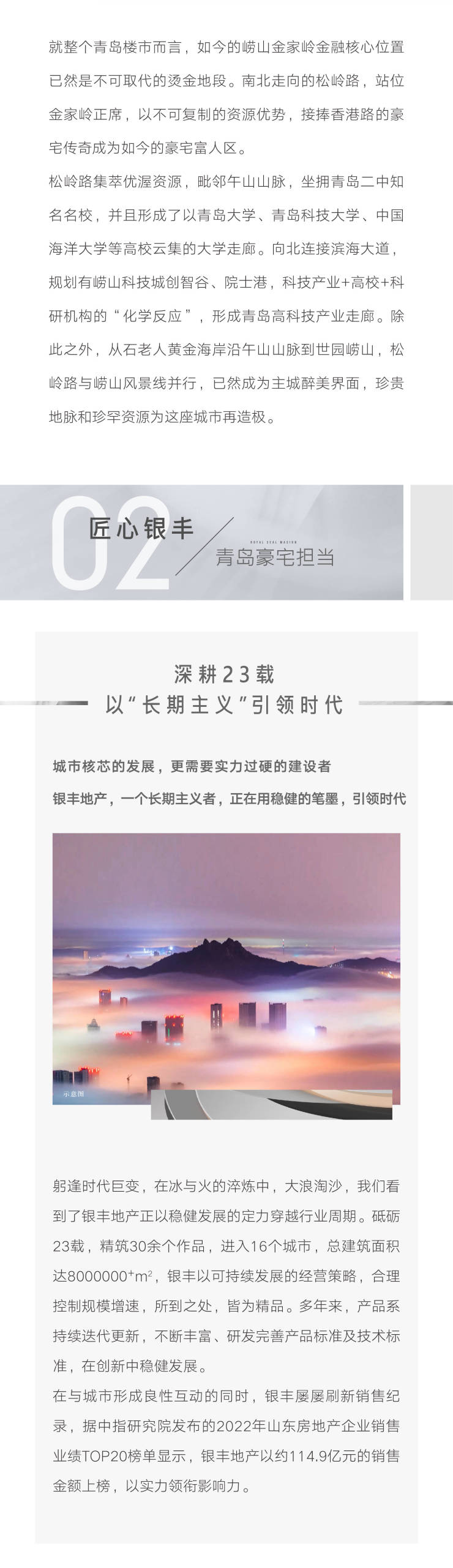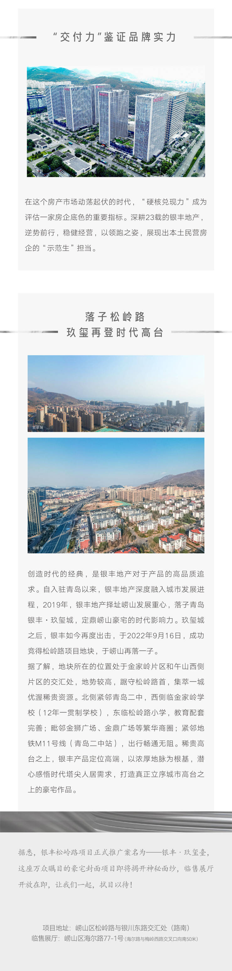 创造时代的经典,是银丰地产对于产品的高品质追求。自入驻青岛以来,银丰地产深度融入城市发展进程,2019年,银丰地产择址崂山发展重心,落子青岛银丰·玖玺城,定鼎崂山豪宅的时代影响力。玖玺城之后,银丰再度出击,于2022年9月16日,成功竞得松岭路项目地块,于崂山再落一子。