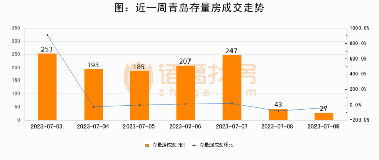 从存量房来看,2023年07月09日青岛存量房单日成交27套,比昨日减少16套,环比下降37.2%。从近一周存量房成交来看,青岛存量房日均成交套数为165套,07月09日单日成交27套,低于近一周平均水平83.6%。