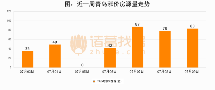 根据诸葛找房数据显示,青岛24小时涨价房源量为83套,较07月08日增加5套,环比上涨6.4%。与此同时,涨价房源占比小幅扩大,业主信心有所提升。