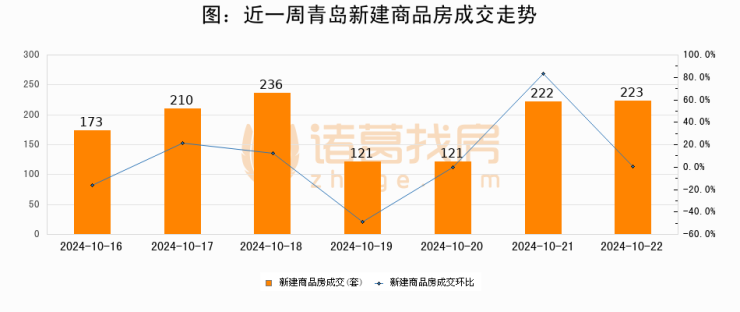 根据青岛市住房和城乡建设局数据显示,2024年10月22日青岛新建商品房成交223套,较昨日增加1套,环比上涨0.4%