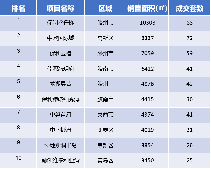 从各项目成交情况来看,位于胶州市的保利叁仟栋以销售面积10303㎡,成交88套的成绩列榜单排名前列;据售楼处获悉,保利叁仟栋目前一期、二期118-160㎡套三小高在售,均价约9000元/㎡;三期89-118㎡套三高层在售,均价约8000元/㎡。