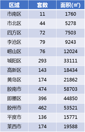 从各区成交情况来看,上周胶南市新建商品住宅成交474套,成交面积为58703㎡,位列上周各片区新建商品住宅成交面积和成交套数首位;胶州市以成交462套,成交面积53521㎡的成绩名列第二;即墨区以单周成交396套,成交面积44850㎡列第三位;