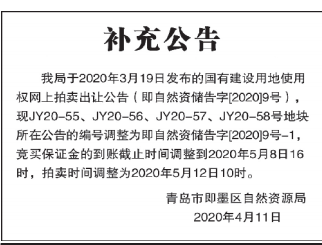 3月19日上午,青岛市即墨区自然资源局决定以网上拍卖的方式出让12宗国有建设用地使用权。而后原公告中JY20-55至JY20-58地块改期至5月12日出让;原公告中的JY20-64地块因故取消出让。