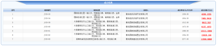 4月17日上午,即墨7宗地块在网上进行拍卖,土地面积共计217320㎡,规划总面积385231㎡。最终,JY20-53、JY20-54地块被青岛地铁资源开发有限公司以底价竞得,JY20-599至JY20-62地块被青岛国商信城置业有限公司以底价竞得,JY20-63地块被青岛国信建设投资有限公司以底价竞得,总成交价格63957.6045万元。