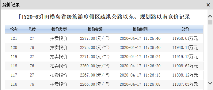 JY20-63地块位于田横岛省级旅游度假区疏港公路以东、规划路以南,土地面积43737㎡,规划建筑面积52484㎡,为70年产权住宅用地,拍卖起始价为2027元/㎡,竞买保证金10638.5068万元。该地块引来三位买家竞相争夺,最终经过121轮竞价,由青岛国信建设投资有限公司以2277元/㎡成交。目前田横岛省级旅游度假区内新建商品住宅均价在7300元左右。