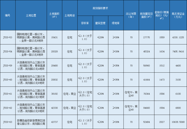 JY20-599至JY20-62地块位于大信镇规划天山三路以东、规划路以南、青新高速以西、规划路以北,土地总面积129824㎡,规划建筑总面积259648㎡,其中二宗为住宅商业混合用地,二宗为纯住宅用地,拍卖起始价较高为1586元/㎡,较低为1473元/㎡,竞买保证金20400万元。