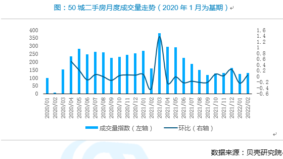 新京报讯(记者 张晓兰)2月28日,贝壳研究院发布2022年2月全国50城二手房市场报告。报告指出,在信贷环境宽松及地方支持性政策利好下,春节后,50城二手房市场成交活跃度快速提升,2月成交量环比增长,房价环比止跌。贝壳研究院预计,在后期信贷支持力度保持、地方“稳楼市”政策跟进、潜在供需均增长叠加市场预期改善下,3月50城二手房市场将进一步“修复”,成交量增价稳。