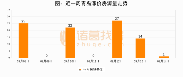 根据诸葛找房数据显示,青岛24小时涨价房源量为1套,较09月13日减少13套,环比下降92.9%。与此同时,涨价房源占比小幅回落,对于购房者来说是一个入市窗口期,购房者可抓住时机入市。