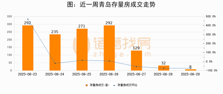 从存量房来看,2025年06月29日青岛存量房单日成交8套,比昨日减少24套,环比下降75%。从近一周存量房成交来看,青岛存量房日均成交套数为179套,06月29日单日成交8套,低于近一周平均水平95.5%。