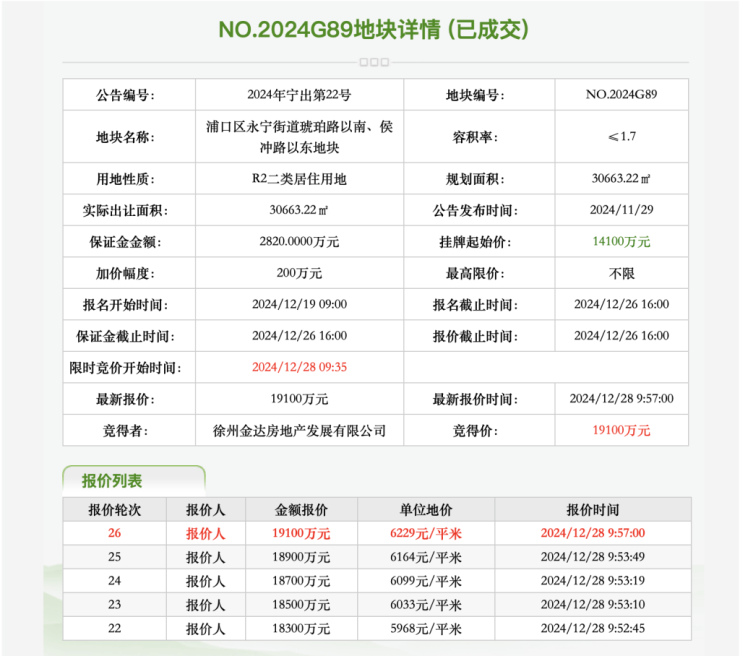 此次溢价率最高的是NO.2024G89地块,即浦口区永宁街道琥珀路以南、侯冲路以东地块。东至建宁西路,西至侯冲路,南至宁南路,北至琥珀路。规划用地性质为R2二类居住用地,出让面积30663.22平方米,容积率1.0<Far≤1.7,建筑高度≤35米。挂牌起始价1.41亿元。该地块经过26轮竞价,由江苏金陵建工集团旗下徐州金达房地产发展有限公司以1.91亿元竞得,溢价率35.46%,单位地价6229元/平方米。