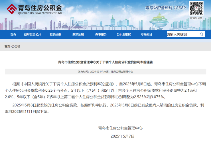 5月7日,青岛市住房公积金管理中心发布通知,公告青岛市个人住房公积金贷款利率下调0.25个百分点,自2025年5月8日起开始执行。