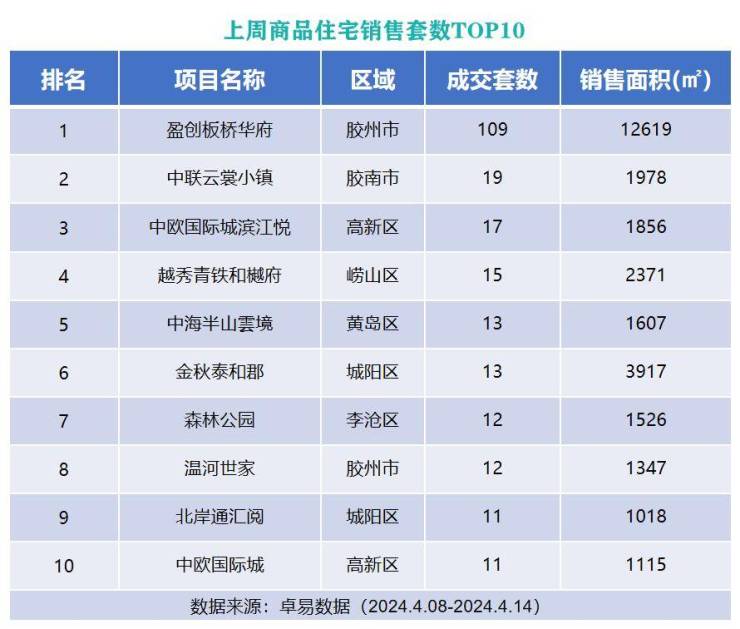 从各项目成交套数来看,位于胶州市的盈创板桥华府以成交109套的成绩列榜单首位;位于西海岸新区的中联云裳小镇以成交19套成绩上榜第二位;位于高新区的中欧国际城滨江悦以成交17套的成绩列榜单第三位。