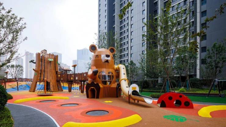 在园区中轴线的东侧,一只熊熊造型的设施极为醒目。玺宝山趣乐园,是珺府在深入研究儿童行为及生活习惯后,打造的1-12岁全龄游乐区。让一位虚拟主人公小熊“玺宝”,成为陪伴孩子们成长的玩伴。游乐区不仅按照不同年龄需求打造不同场景设施,场地主要建材均采用北欧进口的赤松木,保证良好触感的同时,更健康环保。