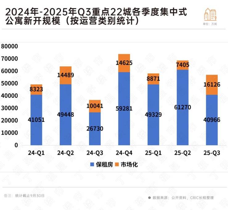 10月8日,据克而瑞地产研究中心发布的报告显示,克而瑞长租不完全统计的数据显示,2025年三季度全国22个重点城市的集中式长租公寓市场共计约132个新项目入市,新增房源数量约为5.71万套(间),相较2024年Q3同比增长约55%。