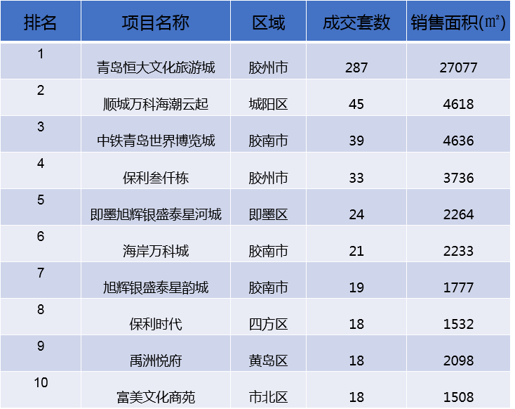 排在第四到第十位的分别是保利叁仟栋、即墨旭辉银盛泰星河城、海岸万科城、旭辉银盛泰星韵城、保利时代、禹洲悦府、富美文化商苑。从各区及各项目的成交情况来看,上周新建商品住宅成交以近郊各区项目为主,主城区仅保利时代及富美文化商苑两个项目上榜。