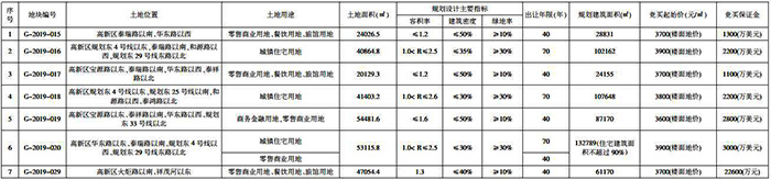 编号G-2019-021地块位于高新区火炬路以南、祥茂河以东,土地面积47054.4㎡,土地用途为零售商业用地、餐饮用地和旅馆用地,容积率1.3,建筑密度≤40%,绿地率大于等于10%,规划建筑面积为61170㎡,拍卖起始价为3700元/㎡,竞买保证金为22600万元。