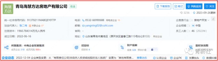 据公开资料显示,青岛海慧方达房地产有限公司成立于2022年6月16日,法定代表人张二伟,企业位于山东省青岛市黄岛区(原开发区富春江路115号办公B133),企业股东分别为济南中海地产投资有限公司和青岛坤园投资有限公司。