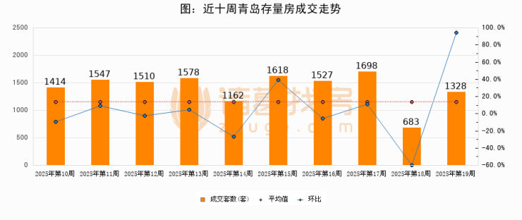存量房方面,第19周青岛存量房成交1328套,较上周增加645套,环比上涨94.4%。从近十周成交走势来看,周均成交套数为1406套,本周低于平均水平5.5%。