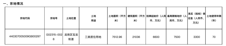 其中,龙岗区宝龙街道 G02315-0028地块的土地面积为7512.96平方米,建筑面积21036平方米,土地用途为三类居住用地,地块挂牌起始价6600万元,最高限制地价7500万元。