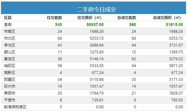 11日全市二手房成交360套,总成交面积31615.80㎡,包括住宅345套,成交面积30837.80㎡。(图为各区市住宅交易量数据)
