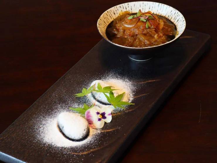●菜品实拍 从左→右:黄焖花胶拼灵芝、芙蓉海螺片、金汤海鲜狮子头、杭式酱鸭