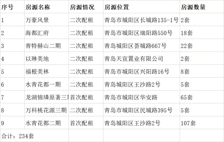 本次配租房源首次配租172套、二次配租62套,共计234套。