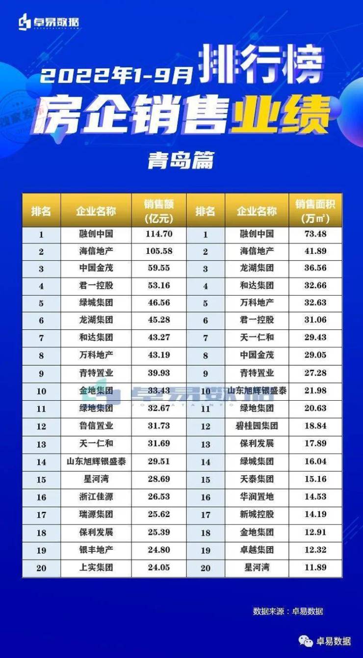 以下是2022年1-9月青岛房地产TOP20具体销售情况以及单盘销售情况。