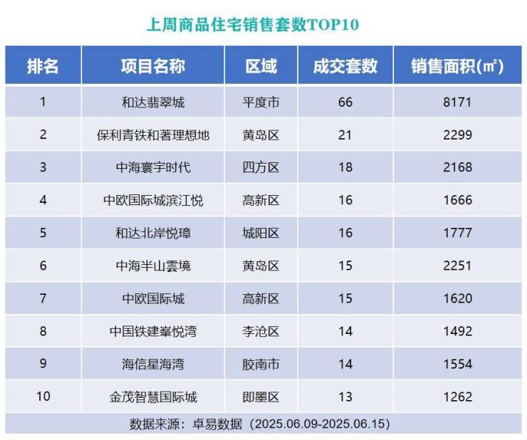 从各项目成交套数来看,位于西海岸新区的保利青铁和著理想地以成交21套的成绩上榜第二位;位于市北区的中海寰宇时代以成交18套的成绩列榜单第三位。