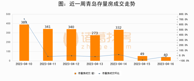 从存量房来看,2023年04月16日青岛存量房单日成交40套,比昨日减少9套,环比下降18.4%。从近一周存量房成交来看,青岛存量房日均成交套数为252套,04月16日单日成交40套,低于近一周平均水平84.1%。