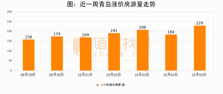 根据诸葛找房数据显示,青岛24小时涨价房源量为229套,较10月04日增加45套,环比上涨24.5%。与此同时,涨价房源占比小幅扩大,业主信心有所提升。