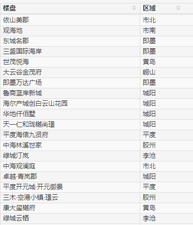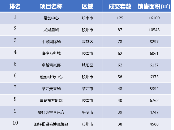 排在第四到第十位的分别是海岸万科城、先进青岚郡、融创时代中心、莱西天泰城、青岛东方影都、碧桂园桃李东方、旭辉银盛泰博观御品。从各区及各项目的成交情况来看,上周新建商品住宅成交前十位均位于周边城区,主城区无项目上榜。