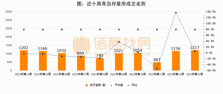 存量房方面,第43周青岛存量房成交1217套,较上周增加61套,环比上涨5.3%。从近十周成交走势来看,周均成交套数为996套,本周高于平均水平22.2%。