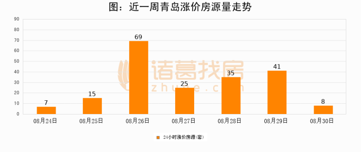 根据诸葛找房数据显示,青岛24小时涨价房源量为8套,较08月29日减少33套,环比下降80.5%。与此同时,涨价房源占比小幅回落,对于购房者来说是一个入市窗口期,购房者可抓住时机入市。