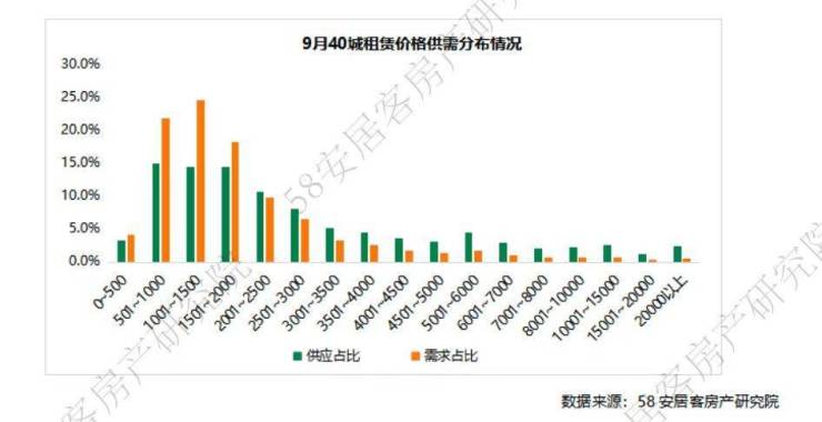 从价格上来说,9月份,重点监测的40城租赁供应价格分布中,主力供应价格区间在501-2500元/月/套,约占市场总供应的55%,其次为价格在2501-4000元/月/套区间的房源,占比约18%。在租赁市场挂牌供应量下降的情况下,4000元/月/套以下房源供应占比上升约2%。从需求来看,价格在501-2500元/月/套的中低价房源仍为市场主力,占比约64%,需求结构相对稳定。