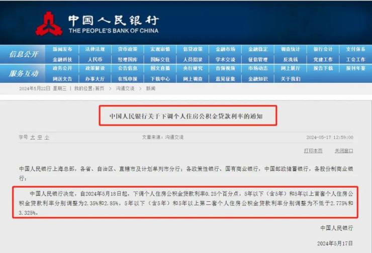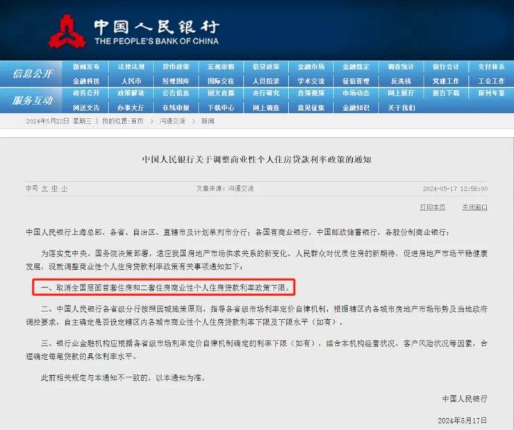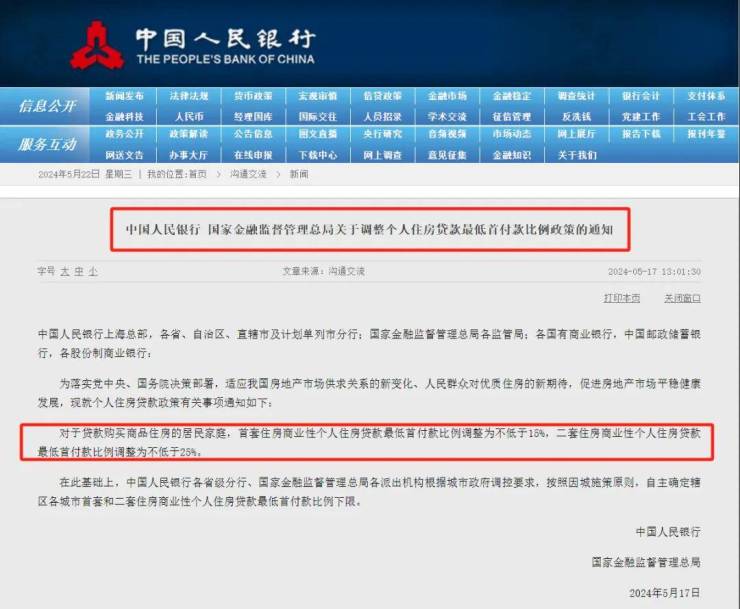 5月17日,楼市颁布3大王炸政策,首套住房商业性个人住房贷款最低首付款比例调整为不低于15%,二套住房商业性个人住房贷款最低首付款比例调整为不低于25%;商业性个人住房贷款利率方面,取消全国层面首套住房和二套住房商业性个人住房贷款利率政策下限;自2024年5月18日起,下调个人住房公积金贷款利率0.25个百分点,5年以上首套利率降至2.85%,二套利率降至3.325%。