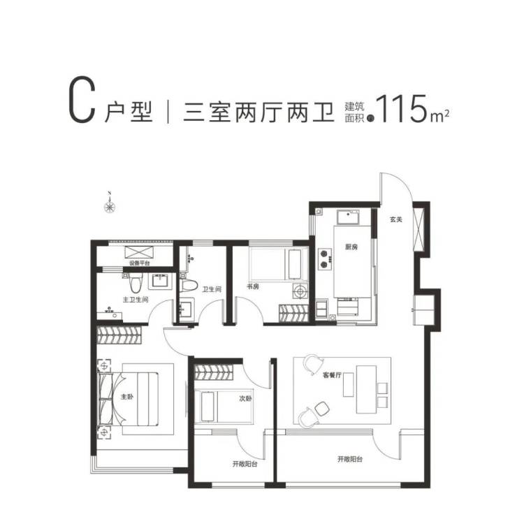 建面约115㎡三室两厅两卫,LDKB餐客厅一体化,客厅开间约5.2米,同面积段户型中实属难得;南向三开间,将园林景观延伸至室内;主卧套房设计,带独立卫生间,主人尊崇感彰显无疑。