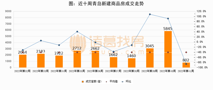 进入2022年第41周(10月03日-10月09日),青岛新建商品房成交802套,较上周减少5043套,环比下降86.3%