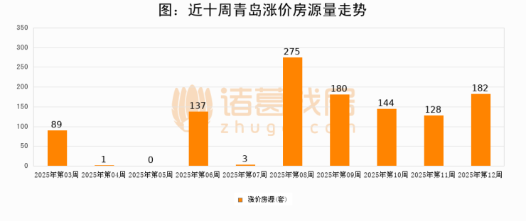 从调价房源来看,第12周青岛涨价房源182套,较上周上涨42.2%。与此同时,12周涨价房源占比提升0.65个百分点,业主信心持续恢复。