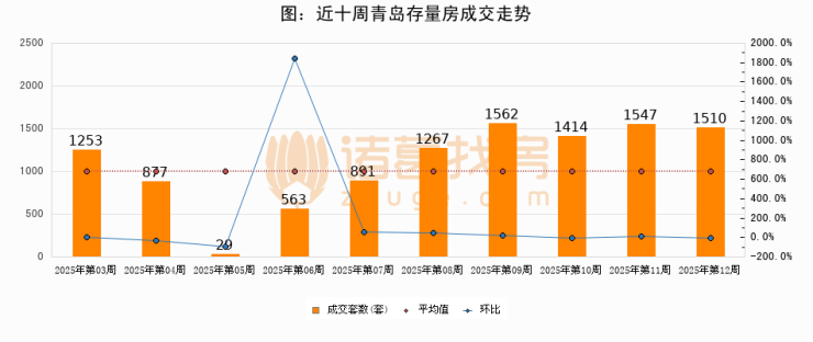 存量房方面,第12周青岛存量房成交1510套,较上周减少37套,环比下降2.4%。从近十周成交走势来看,周均成交套数为1091套,本周高于平均水平38.4%。