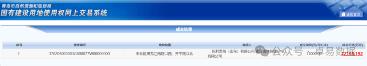 6月17日,保利发展(山东)有限公司,青岛青铁智能科技有限公司 摘得市北新都心果品地块,总建面6.56万㎡,成交价7.2亿,楼板价11000元/㎡。